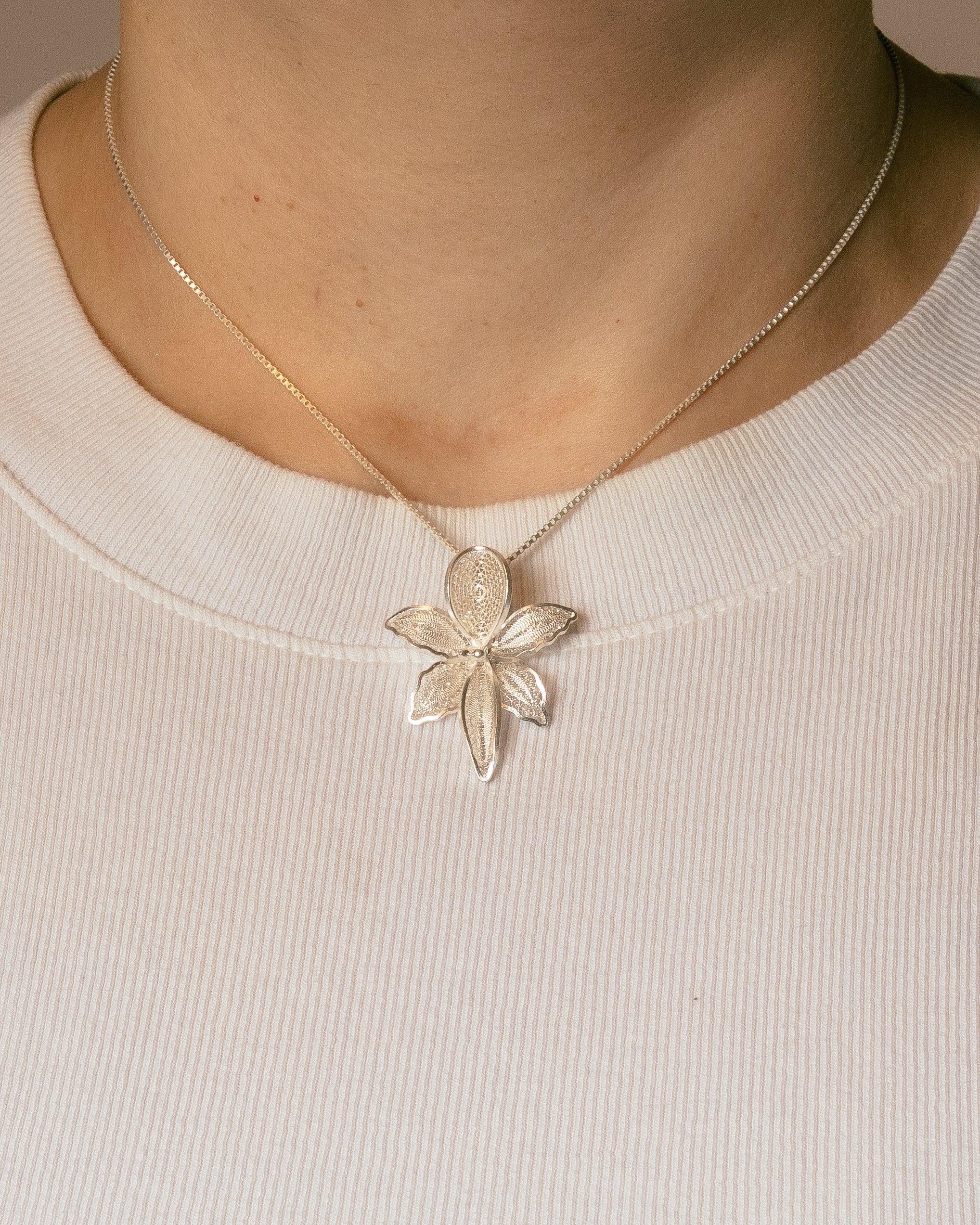 Adorn yourself with the charm of Ecuador's Gualaceo with this neck with unique orchid filigree pendant necklace. Handcrafted by skilled artisans, each pair embodies the intricate beauty and cultural heritage of the region in a timeless and elegant design.